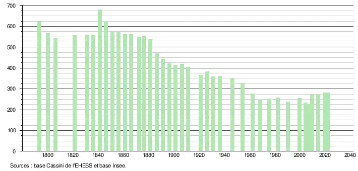 L'évolution du nombre d'habitants est connue à travers les recensements de la population effectués dans la commune depuis 1793. Pour les communes de moins de 10 000 habitants, une enquête de recensement portant sur toute la population est réalisée tous les cinq ans, les populations de référence des années intermédiaires étant quant à elles estimées par interpolation ou extrapolation[22]. Pour la commune, le premier recensement exhaustif entrant dans le cadre du nouveau dispositif a été réalisé en 2004[23].
