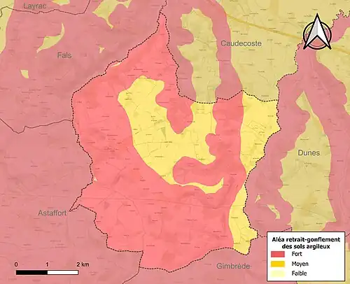 Le retrait-gonflement des sols argileux est susceptible d'engendrer des dommages importants aux bâtiments en cas d’alternance de périodes de sécheresse et de pluie[17]. La totalité de la commune est en aléa moyen ou fort (91,8 % au niveau départemental et 48,5 % au niveau national)[Carte 2]. Depuis le , en application de la loi ELAN, différentes contraintes s'imposent aux vendeurs, maîtres d'ouvrages ou constructeurs de biens situés dans une zone classée en aléa moyen ou fort[Note 2],[18].