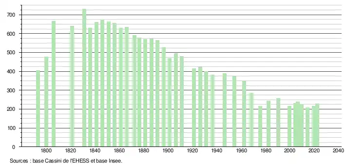 L'évolution du nombre d'habitants est connue à travers les recensements de la population effectués dans la commune depuis 1793. Pour les communes de moins de 10 000 habitants, une enquête de recensement portant sur toute la population est réalisée tous les cinq ans, les populations de référence des années intermédiaires étant quant à elles estimées par interpolation ou extrapolation[26]. Pour la commune, le premier recensement exhaustif entrant dans le cadre du nouveau dispositif a été réalisé en 2004[27].