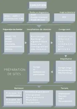 Différents labels de déconstruction (HQE etc.) imposent désormais des pratiques particulières dans la conduite des travaux (pour limiter les nuisances sur chantier et pour le voisinage) et dans le traitement des déchets[5]. Ainsi, les maîtres d’ouvrage émettent des cahiers des charges (charte chantier vert) dont les ambitions dépassent bien souvent les objectifs réglementaires[6].