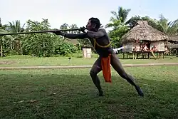 Les indiens s'en servent pour en enduire les pointes de flèches, notamment de sarbacanes, arme qui ne fonctionne que grâce à ce poison : Le gibier est empoisonné, atteint de paralysie musculaire et meurt par asphyxie peu après avoir été touché sans effrayer les autres proies éventuelles d'où son nom indien : « La mort qui tue tout bas ». La consommation de la viande est ensuite possible car le curare ne provoque pas d'empoisonnement par ingestion[43]. Les tribus d'Amazonie, et les Jivaros, n'emploient pas le curare contre l'être humain. Les indiens l'utilisaient aussi comme stomachique (Humboldt).