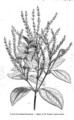 - Loganiaceae (liane Strychnos, espèces différentes suivant les régions : (Strychnos guianensis, Strychnos castaneaei, Strychnos crevauxii, Strychnos subcordata, Strychnos toxifera, Strychnos Jobertiana, Strychnos Yapurensis[27]), Sciadotenia toxifera (Krukoff and A. C. Smith)[28] (France)