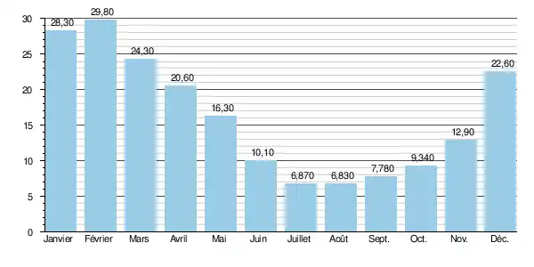 La rivière présente des fluctuations saisonnières de débit, avec des crues d'hiver portant le débit mensuel moyen entre 21,3 et 30 m3/s, de décembre à mars inclus (maximum en février), et des basses eaux d'été, en juillet-août, avec une baisse du débit moyen mensuel jusqu'au niveau encore fort confortable de 6,85 m3/s au mois d'août.