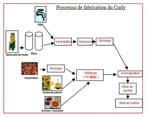 Les Curly sont fabriqués à partir de semoule de maïs. Une fois réhydratée, la semoule passe dans un extrudeur qui, sous pression, donne à la pâte la forme du produit, appelé « collets ». Ils sont ensuite séchés à très haute température pour leur donner le croustillant. Pour donner le goût aux collets, on les enrobe avec un mélange appelé slurry (cacahuète, huile, sel, arôme).