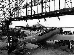 Un R5C-1 du 4th Marine Air Wing est visible derrière cette épave de chasseur bombardier japonais. Tinian, 30 juillet 1944.