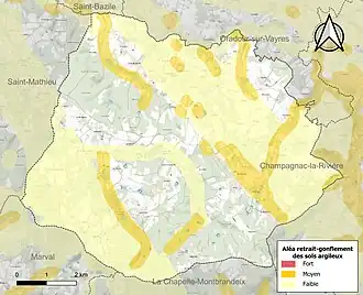 Le retrait-gonflement des sols argileux est susceptible d'engendrer des dommages importants aux bâtiments en cas d’alternance de périodes de sécheresse et de pluie[20]. 14,9 % de la superficie communale est en aléa moyen ou fort (27 % au niveau départemental et 48,5 % au niveau national métropolitain)[Carte 2]. Depuis le , en application de la loi ÉLAN, différentes contraintes s'imposent aux vendeurs, maîtres d'ouvrages ou constructeurs de biens situés dans une zone classée en aléa moyen ou fort[Note 1],[21].