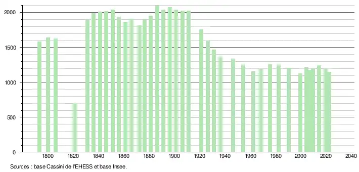 L'évolution du nombre d'habitants est connue à travers les recensements de la population effectués dans la commune depuis 1793. Pour les communes de moins de 10 000 habitants, une enquête de recensement portant sur toute la population est réalisée tous les cinq ans, les populations de référence des années intermédiaires étant quant à elles estimées par interpolation ou extrapolation[36]. Pour la commune, le premier recensement exhaustif entrant dans le cadre du nouveau dispositif a été réalisé en 2004[37].