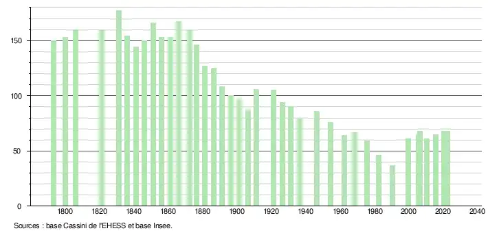 L'évolution du nombre d'habitants est connue à travers les recensements de la population effectués dans la commune depuis 1793. Pour les communes de moins de 10 000 habitants, une enquête de recensement portant sur toute la population est réalisée tous les cinq ans, les populations de référence des années intermédiaires étant quant à elles estimées par interpolation ou extrapolation[18]. Pour la commune, le premier recensement exhaustif entrant dans le cadre du nouveau dispositif a été réalisé en 2005[19].