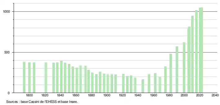L'évolution du nombre d'habitants est connue à travers les recensements de la population effectués dans la commune depuis 1793. Pour les communes de moins de 10 000 habitants, une enquête de recensement portant sur toute la population est réalisée tous les cinq ans, les populations de référence des années intermédiaires étant quant à elles estimées par interpolation ou extrapolation[19]. Pour la commune, le premier recensement exhaustif entrant dans le cadre du nouveau dispositif a été réalisé en 2005[20].