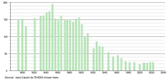 L'évolution du nombre d'habitants est connue à travers les recensements de la population effectués dans la commune depuis 1793. Pour les communes de moins de 10 000 habitants, une enquête de recensement portant sur toute la population est réalisée tous les cinq ans, les populations de référence des années intermédiaires étant quant à elles estimées par interpolation ou extrapolation[15]. Pour la commune, le premier recensement exhaustif entrant dans le cadre du nouveau dispositif a été réalisé en 2007[16].