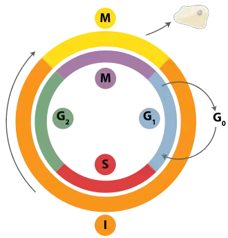 L'interphase est le moment où la cellule vit et effectue tout ce pourquoi elle est programmée (~90% du cycle cellulaire[3]). Elle se prépare aussi à se diviser. Les étapes de la division sont détaillées ci-dessous :
