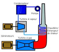 Dans une centrale à cycle combiné, la turbine à combustion est actionnée par les gaz issus de la combustion à haute température (jusqu'à 1 500 °C). En sortie, les fumées produites par la combustion sont encore suffisamment chaudes (entre 400 et 650 °C environ) pour générer de la vapeur d'eau dans une chaudière au moyen d'échangeurs de chaleur. La vapeur sous pression ainsi produite entraîne une turbine à vapeur. Il est enfin nécessaire de disposer d'une source froide (eau de rivière, eau de mer, aéroréfrigérant) pour évacuer la chaleur nécessairement produite par le cycle de vapeur. La chaleur restante peut aussi être récupérée pour faire de la cogénération. Différentes configurations de centrale sont conçues :