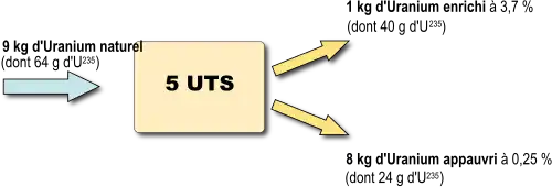Pour produire 1 kg d'uranium enrichi, 9 kg d'uranium naturel sont nécessaires et 8 kg d'uranium appauvri sont produits sous forme d’hexafluorure. Pour faciliter son entreposage, celui-ci doit faire l’objet d’une défluoration, à l'issue de laquelle il est transformé en octaoxyde de triuranium stable dit « U3O8 appauvri ». Cette opération est effectuée à l'usine W d’Areva NC sur le site du Tricastin[D 1].
