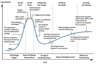 | 2 | Pic des attentes exagérées | Un emballement médiatique aboutit à des attentes exagérées et non réalistes. Des startups se créent pour développer et commercialiser des produits basés sur la nouvelle technologie |
