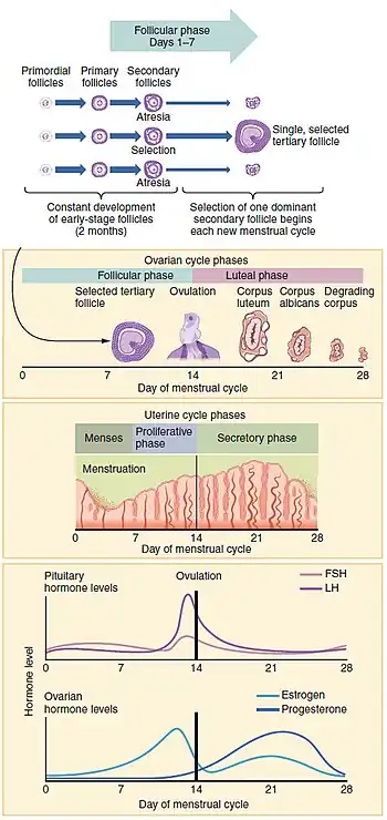 Le cycle menstruel, contrôlé par des hormones, commence à la puberté et se termine à la ménopause par épuisement des follicules ovariens et par augmentation de résistance des follicules ovariens à l'action des gonadotrophines. Sa durée de référence est de 28 jours (4 semaines) en Occident mais varie sans anomalie de plus ou moins 4 jours, selon les populations et les individus[5]. En Inde, sa durée a été mesurée à 31,2 ± 3,2 jours en 1974 et à 31,8 ± 6,7 jours en 1992[6]. Selon une étude portant sur 2 303 Européennes (26 912 cycles) et 721 Nord-Américaines (4 786 cycles), le cycle menstruel est finement régulé par une horloge interne, elle-même influencée occasionnellement par le cycle lunaire[7],[8].