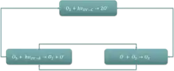 - où EK désigne l'excès d'énergie de la réaction qui se manifeste comme un supplément d'énergie cinétique. Ces deux réactions forment le cycle ozone-oxygène, dans lequel l'énergie chimique libérée lors de la réaction entre O• et O2 est convertie en énergie cinétique du mouvement moléculaire. L'effet global est de convertir en chaleur les rayons UV-B pénétrant, sans aucune perte nette d'ozone. Ce cycle a lieu dans la couche d'ozone dans un équilibre stable, tout en protégeant les couches inférieures de l'atmosphère contre les rayons UV (alors nocifs pour la plupart des êtres vivants). Il est également l'une des deux principales sources de chaleur de la stratosphère (l'autre étant l'énergie cinétique libérée lors de l'O2 est photolysé en radicaux).