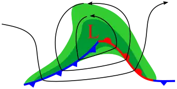 Ceci est expliqué dans le modèle norvégien par le fait que l'air froid plus dense est difficile à déloger. Ainsi l'air doux du secteur chaud est repoussé en altitude le long du front chaud et n'érode que lentement l'air froid de surface ce qui permet au front froid en mouvement de le rattraper[4],[6]. Ce déplacement crée un mouvement vertical de l'air chaud et l'humidité se condense finalement pour donner des nuages et ensuite des précipitations (zone verte).