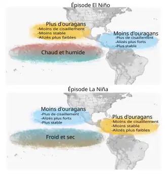 Les épisodes El Niño entraînent une augmentation de la formation de cyclones tropicaux dans le Pacifique sud et le Pacifique nord-est central entre 160° E et la ligne de changement de date, tandis que d'autres bassins enregistrent une diminution comme dans l'Atlantique Nord, le nord-ouest du Pacifique à l'ouest de 160° E et la région australienne. Les Niñas apportent généralement des conditions opposées[21],[22]. Ces altérations de l'activité des cyclones tropicaux sont dues à divers effets de l'ENSO : en modulant l'intensité du creux local de mousson, en repositionnant l'emplacement de ce creux et en modifiant le cisaillement vertical des vents de la troposphère[21],[22].