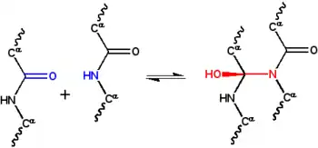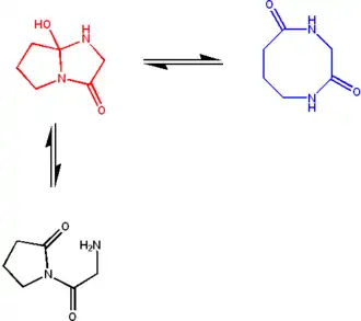 Une clarification de la terminologie est ici nécessaire. La réaction cyclol classique est l'addition de l'amine NH d'un groupe peptide au radical carbonyle C=O d'un autre peptide ; le produit de la réaction est appelé un azacyclol. Par analogie, un oxacyclol est formé lorsqu'un radical hydroxyle OH fait une addition avec un carbonyle peptidyl. De même, le thiacyclol se forme par addition d'un radical thiol SH avec un carbonyle peptidyl[74].