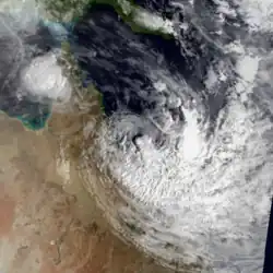 - ↑ (en) Australian Associated Press, « Cyclone lurks off Qld coast And bushfires threaten to flare; in NSW », The Advertiser, .