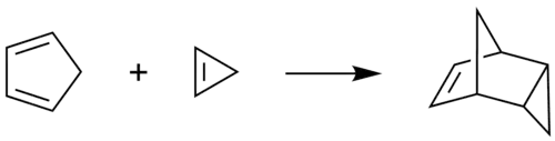 Le cyclopropène peut aussi subir une réaction de Diels-Alder avec le cyclopentadiène pour donner l'endo-tricyclo[3.2.1.02,4]oct-6-ène. Cette réaction est communément utilisée pour détecter la présence de cyclopropène après sa synthèse[7].