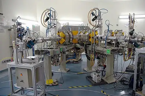 - plusieurs types de faisceaux de particules, en particulier des faisceaux de protons, de deutons ou de particules alpha, alors que la plupart des cyclotrons existant ne produisent que des faisceaux de protons ;