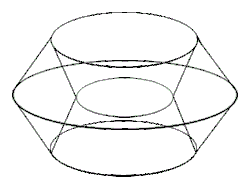 On remarque l'apparition de deux nouveaux cylindres verticaux (le bleu et le jaune sur la figure ci-à-droite). Bien qu'apparaissant différemment par rapport aux deux premiers, ils sont bien des mêmes dimensions, c'est-à-dire réguliers et de longueurs unitaires.