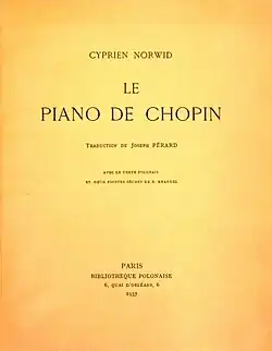 - Le Piano de Chopin, traduction de Joseph Pérard avec le texte polonais et deux pointes sèches de Konrad Brandel (Norwid en 1846, dessin par lui-même), Paris, Bibliothèque Polonaise, 1937, 33 p.