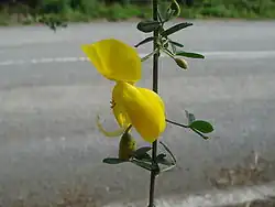 Les fleurs sont solitaires ou en petits fascicules axillaires. Le fruit est une gousse papyracée, plane, finement pubescente, longue de 4 à 5 cm et large de 8 mm. La carène est obtuse, ovoïde ; les ailes larges et ovoïdes[1].