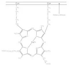Les noyaux porphyrine sont fixés par des liaisons covalentes à la partie protéique des cytochromes (voir figure).