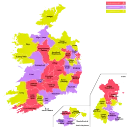 Selon la répartition des votes, il est possible que les candidats restants n'atteignent pas le quota, auquel cas le siège est attribué au dernier en lice après élimination de tous ceux ayant recueilli moins de votes cumulés[1]. Les députés élus sont appelés Teachta Dála, abrégé en TD. Ils sont en moyenne 3,9 par circonscription.