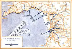 Le 13 septembre, les Allemands lancent leur contre-offensive. Alors que les groupements tactiques Hermann Göring attaquent le flanc nord de la tête de pont, l'attaque principale stagne à la frontière entre les deux corps alliés qui s'étendent à peu près de Battipaglia à la mer, le poids le plus important devant tomber du côté du VIe corps[51]. Le matin du 13 septembre, des éléments de la 36e division du général de division Walker attaquent et capturent Altavilla sur les hauteurs à environ 14 km derrière Paestum, mais une contre-attaque les force à se replier à la tombée de la nuit. Au cours de l'après-midi, deux groupements tactiques allemands, Kleine Limburg et Krüger, attaquent Persano et envahissent le 1er bataillon du 157e d'infanterie avant de traverser la Sélé pour engager le 2e bataillon du 143e d'infanterie et l'anéantir pratiquement[52].