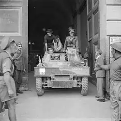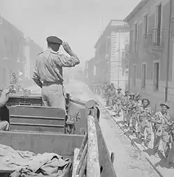 Le général Montgomery salue ses troupes depuis un DUKW, Reggio de Calabre, Italie, septembre 1943.
