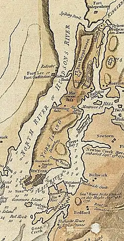 Pendant ce temps, les troupes britanniques, menées par le général Howe, s'avançaient au nord en suivant la berge est de l'East River, en direction de King's Bridge. Durant la nuit du , la frégate britannique Rose profita d'une marée montant vers le nord ; remorquant une trentaine de bateaux à fond plat, elle put atteindre Newtoon Creek, où elle mouilla. Le lendemain, davantage de petits bateaux la rejoignirent, et trois navires de guerre, les HMS Renown, HMS Repulse et HMS Pearl, accompagnés de la goélette HMS Tryal, naviguèrent dans l'Hudson[14],[15].