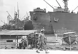 Le développement de Lae en tant que port, en revanche, est envisagé dès le départ ; mais lorsque la ville est capturée, le port est bloqué par des barges coulées et des débris. Les seules installations de décharge sont deux jetées branlantes incapables de contenir des camions. La première cargaison est livrée par LST et ramenée à terre sur la plage par des DUKW et des LCM et des allèges. Les DUKW australiens et américains sont exploités comme un pool commun. Au départ, la marine américaine n'autorise les LST à arriver que la nuit et ils doivent partir avant le lever du jour. Ce n'est qu'en novembre qu'ils ont eu la permission d'opérer à la lumière du jour. Les barges japonaises coulées sont déblayées par une grue flottante de 150 tonnes. Les ingénieurs américains ont ensuite installé un quai flottant, remorqué jusqu'à Lae par sections. Celui-ci ouvre le 20 octobre et un navire de type C1, le Cape Kreig, y débarque ce jour-là. Un nouveau quai est achevé le 23 novembre, bien qu'ayant été utilisé pour décharger le Liberty ship Fremont Older le 15 novembre. Une jetée de carburant est construite, ainsi qu'une installation de stockage de pétrole en vrac, et le premier pétrolier y est déchargé le 20 novembre. Un pipeline de 4 pouces est créé jusqu'à Nadzab[71][76].