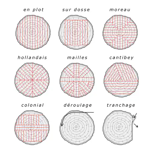 Ce débit est beaucoup moins courant car il nécessite une manutention importante. Une série de sciages perpendiculaires permet l'obtention d'une part importante de bois de quartier.