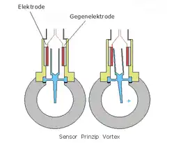 Un débitmètre à effet vortex est basé sur ce phénomène de génération de tourbillons, appelé effet de Karman. Lorsqu'un fluide rencontre un corps non profilé, il se divise et engendre de petits tourbillons ou vortex alternés, de part et d'autre et en aval du corps non profilé. Ces tourbillons engendrent des zones de pression variable, détectées par un capteur capacitif doté d'un cristal piézo-électrique[1]. La fréquence de génération des tourbillons est directement proportionnelle à la vitesse du fluide.