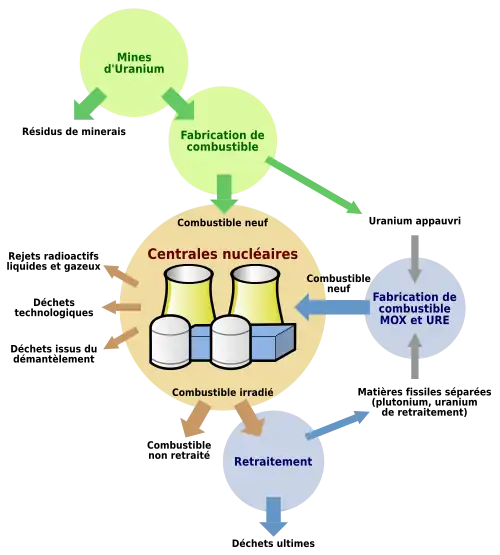 Le retraitement nucléaire consiste à séparer les produits de fission et les actinides, qui sont les déchets nucléaires proprement dits, du combustible qui n'a pas encore réagi, et qui peut être recyclé[12].