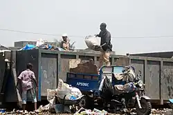 Un collecteur d'ordures ménagères vidant sa cargaison à Abidjan, en Côte d'Ivoire.
