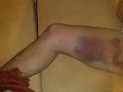 - Dans les heures ou jours suivants apparaissent un ou plusieurs hématomes, souvent accompagnés de phénomènes de décoloration et d'ecchymoses autour du muscle déchiré ou élongé ; le membre peut gonfler, avec un œdème dont l'importance varie selon la gravité et la localisation de la déchirure et selon la suffusion sanguine secondaire, mais aussi selon la qualité des premiers soins donnés au patient (cryothérapie...) ; si le placard œdémateux et inflammatoire suit le trajet d'une veine saphène, il doit faire évoquer une thrombose veineuse superficielle ; les ecchymoses sont plus ou moins importantes et visibles selon l'ampleur, la position et la profondeur de la blessure, et selon l'atteinte du système vasculaire.
