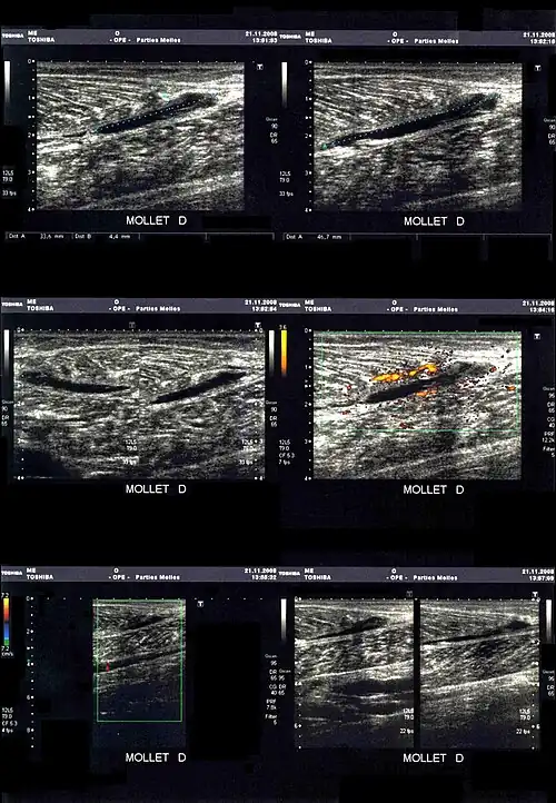 - échographie/échotomographie : « examen le plus utile et le moins cher, permet une étude des fibres musculaires, des tendons et des aponévroses. Ses limitations sont la mauvaise analyse des zones profondes, comme l’insertion proximale des ischio-jambiers, et la difficulté à détecter parfois les cicatrices »[3].