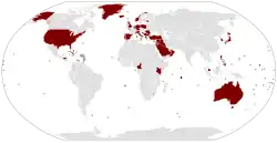 Il y avait 38 grandes et moyennes installations américaines réparties dans le monde en 2005 - principalement des bases aériennes et navales - environ le même nombre que les 36 bases navales et garnisons de l'armée britannique à son zénith impérial en 1898. L'Empire romain à son apogée en 117 après Jésus-Christ avait besoin de 37 bases majeures pour contrôler son royaume de la Grande-Bretagne à l'Égypte, de l'Hispanie à l' Arménie romaine[17]. L'historien de Yale, Paul Kennedy, compare la situation américaine à celle de la Grande-Bretagne avant la Première Guerre mondiale. Il commente que la carte des bases américaines est similaire à celle de la Grande-Bretagne avant la Première Guerre mondiale[18].