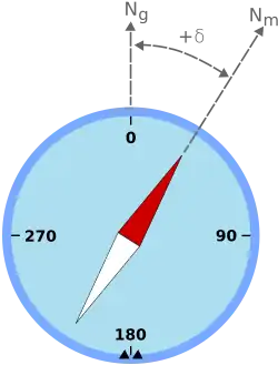 La déclinaison magnétique est, en un point donné sur la surface de la Terre, l'angle formé entre la direction du pôle Nord géographique et le Nord magnétique (il s'agit donc d'un angle sur le plan horizontal du point d'observation). Cet angle est compté positivement vers l'est et négativement vers l'ouest. La direction du Nord magnétique est celle de la composante horizontale de l'inclinaison magnétique (voir article détaillé).
