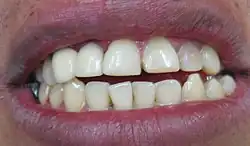 Une décoloration des dents ou décoloration dentaire est une couleur, une teinte ou une translucidité anormale des dents[1]. La décoloration externe est une accumulation de taches sur la surface de la dent. La décoloration interne est due à l'absorption des particules de pigment dans la structure dentaire[2],[3]. Parfois, il existe plusieurs facteurs coexistants différents responsables de la décoloration[4].