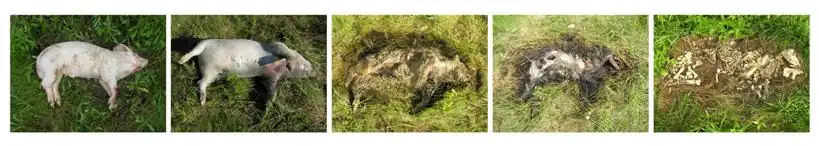 La dégradation des cadavres est un processus post mortem qui comprend plusieurs étapes[4] :