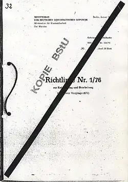 12. Richtlinie 1/76 zur Entwicklung und Bearbeitung Operativer Vorgänge vom 1. Januar 1976. Dokumentiert in: David Gill, Ulrich Schröter: Das Ministerium für Staatssicherheit. Anatomie des Mielke-Imperiums. P. 390