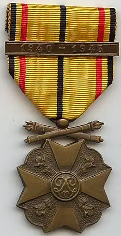 - Le ruban est safran avec une bande noire-jaune-rouge à chaque bord (le rouge vers le centre) et une bande centrale noire pour la décoration 1940-1945.