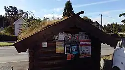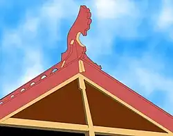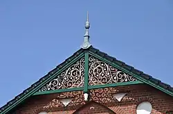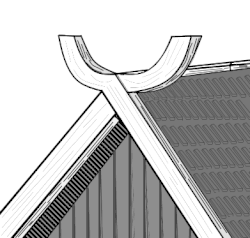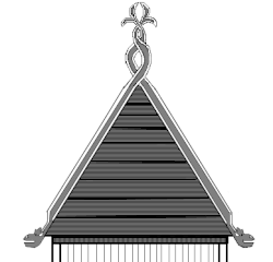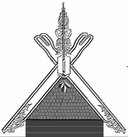 ![]() | ![]() | Décoration de pignon sur toiture végétale avec deux pièces de bois assemblées à mi-bois. Ce modèle était très répandu. Compte tenu du fait que les poutres ou chevrons n'ont aucune forme particulière, pas même schématisée, seul le motif du croisement des deux pièces sert d'ornementation à ce toit. |