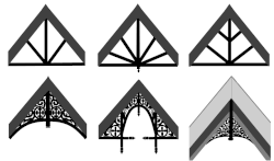 | Différents types de pièces de bois croisées au sommet du pignon | ||