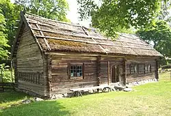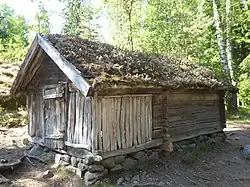 Par conséquent, la maison finno-suédoise vernaculaire la plus ancienne demeure pendant longtemps une cabane en rondins posés horizontalement. Il s’agit d’une maison-bloc sans cheminée pour les hommes et les bêtes qui n’est pas sans rappeler l’isba noire en Russie partie septentrionale[29]. Un foyer ouvert se trouve au centre de la pièce pour chauffer et cuisiner. Dépourvue de fenêtres, et encore moins de fenêtres vitrées, la fumée qui s’accumule dans la seule pièce habitable doit être évacuée par un orifice dans la paroi. Le toit est couvert d’écorces de bouleau, de tourbe ou de chevrons[28].